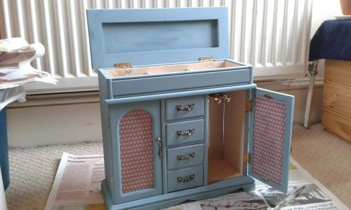 I found a jewelry box in a charity shop a couple of days ago, but while there were some things I liked about it (the bottom part, the handles) there were some things I definitely didn’t (the orange varnish, the sad little glass flowers.)